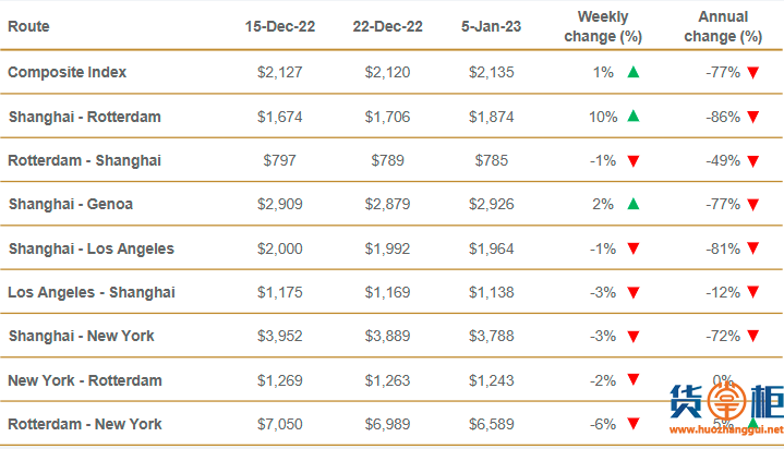 继最新一期上海集装箱运价指数(SCFI)迎来小幅上升后,德路里WCI终于在2023年首次公布的世界集装箱综合指数升至2135美元,升幅0.7%,这是该指数自2022年2月以来连续43周下滑后首次上涨。值得一提的是,几大主要集装箱运价指数包括包括SCFI、WCI、FBX这三大指数的欧洲航线都迎来运价上扬,WCI上涨10%、FBX上涨14%。