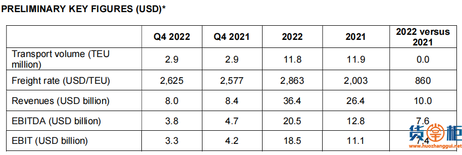 由于现货市场价格暴跌及合同价格面临压力,该公司第四季度的平均运费比第三季度下降了15%,从3106美元/TEU降至2625美元/TEU,但高于2021年第四季度的平均运费(2577美元/TEU)。