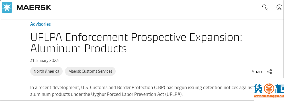 近日,马士基发布公告称,美国海关和边境保护局(CBP)已开始根据《维吾尔强迫劳动预防法》(UFLPA)发布针对铝制品的扣留通知,尤其是来自中国新疆地区的铝产品。