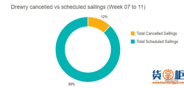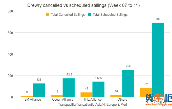 在此期间,66%的停航发生在跨太平洋东行航线,27%发生在亚洲至北欧和地中海航线,7%发生在跨大西洋西行贸易航线。THE联盟已宣布取消42个航次,其次是海洋联盟和2M联盟,分别取消了15个航次和9个航次。同期,非航运联盟取消了16个航次。