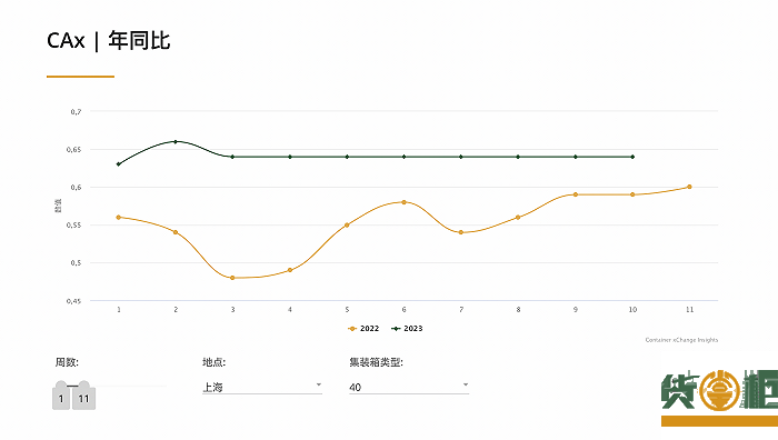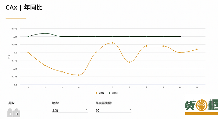 具体来看,今年前10周,上海40英尺集装箱CAx的数值均高于去年同期,其中第二周达到0.66,之后几周稳定在0.64。作为对比,2022年第三周,上海40英尺集装箱CAx的数值只有0.48,最高时也仅为0.59。