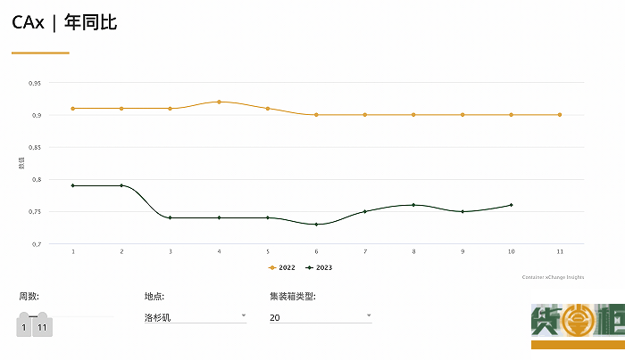 Container xChange数据显示,今年前10周,洛杉矶20英尺集装箱CAx的数值较去年有所下降,但依旧处在0.73-0.79的高位。(截图来自Container xChange)