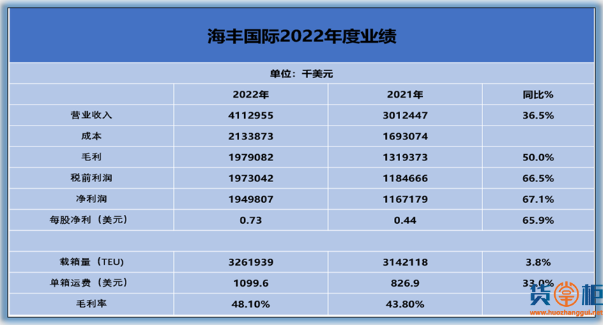 海丰国际2022年净利19.5亿美元,增长67.1%