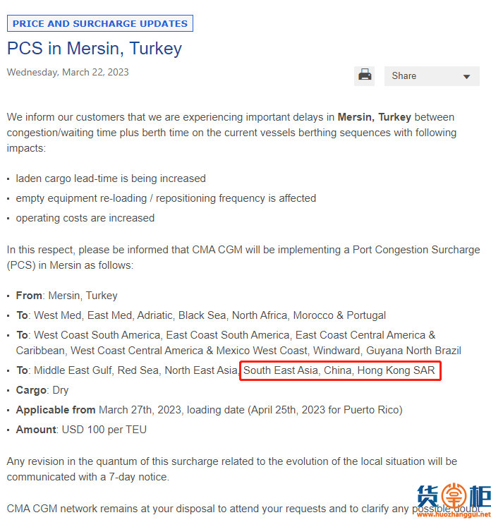 3月22日,达飞发布通知称,由于梅尔辛港严重拥堵,船舶排队靠泊和等待时间超长遭遇严重延误,导致集装箱货物交货期增加、集装箱装货和回空效率低、运营成本增加等。鉴于此,达飞宣布在梅尔辛港征收港口拥堵附加费(PCS)。