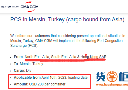 继马士基上月底宣布停止接收往返梅尔辛港的现货预订后,达飞日前发布告客户书,通知称考虑到土耳其梅尔辛目前的运营情况,CMA CGM将实施以下港口拥堵附加费 (PCS):