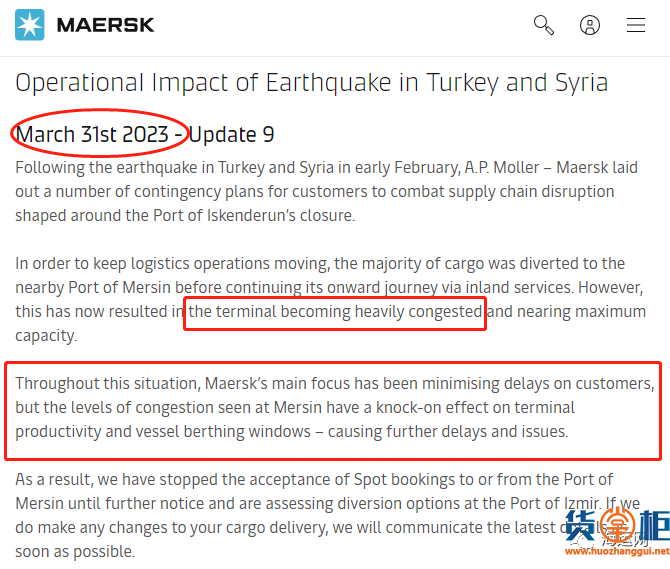 此前,3月31日马士基发布的客户资讯中表示,主要重点是尽量减少货物的延误,但梅尔辛港的拥堵程度对码头运营和船舶靠泊产生了连锁反应,导致进一步的延误。
