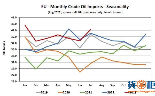 与此同时,俄罗斯的海运进口从2022年1月至7月的6650万吨下降到2023年1月至7月的3760万吨,同比下降43.4%,比2019年1月至7月的8020万吨下降了一半以上。俄罗斯目前已成为欧盟第四大海运石油来源国,占2023年1-7月总量的13.6%。