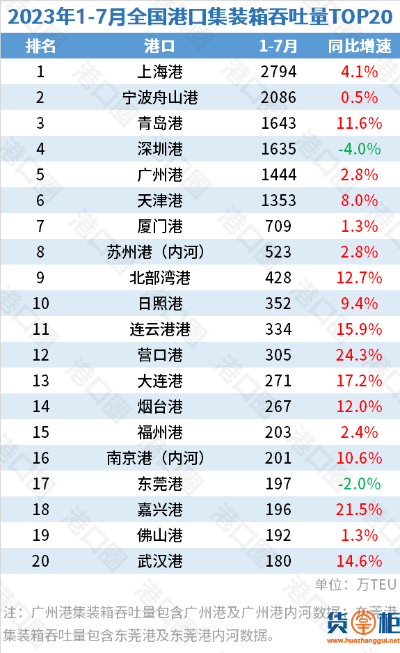 1-7月,全国港口集装箱吞吐量前10名分别是:上海港(第1)、宁波舟山港(第2)、青岛港(第3)、深圳港(第4)、广州港(第5)、天津港(第6)、厦门港(第7)、苏州港(第8)、北部湾港(第9)、日照港(第10)。